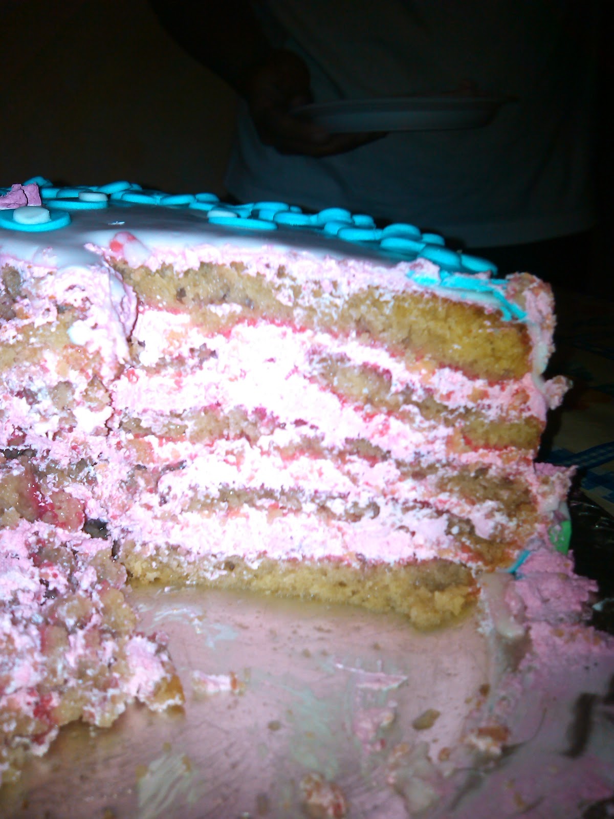 La tarta era un bizcocho buttermilk de vainilla con almibar de mermelada de fresa y relleno de crema de nata y nesquick de fresa, riquisima combinación que sabe a petit suise, teneis que probarlo.